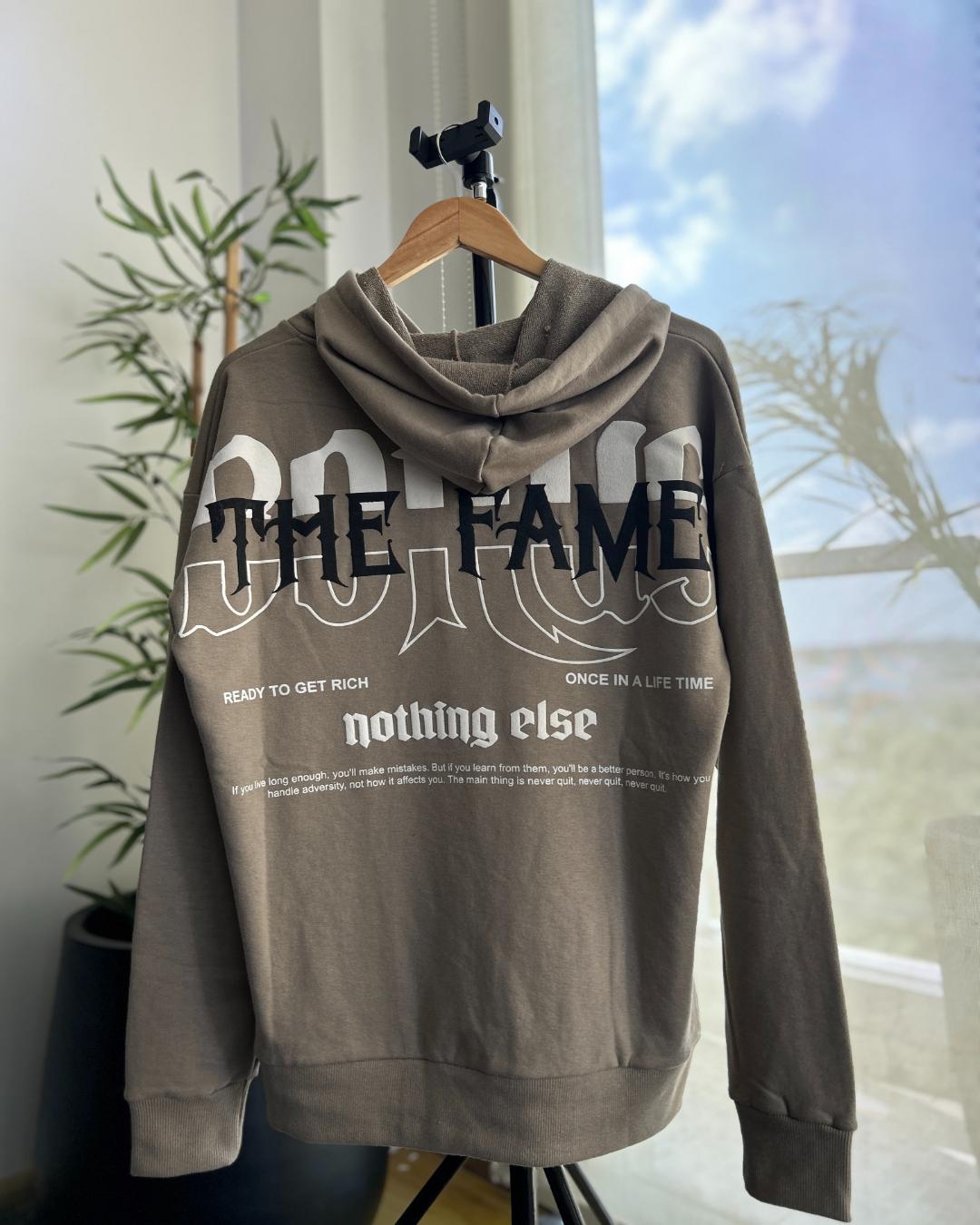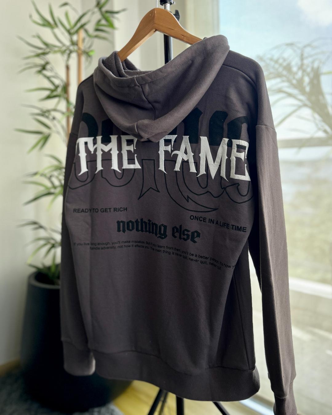 Buzo oversize Fame. Disponible en del S al XL. Canguro rústico. Estampa en espalda.