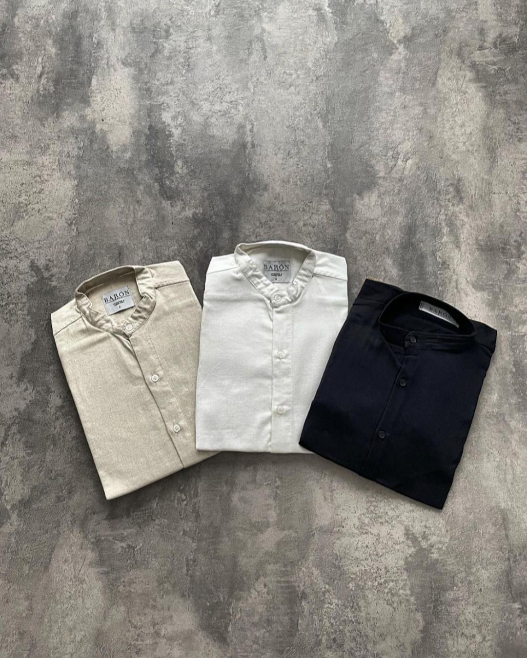 Camisa de lino con cuello mao, disponible en color natural negro y verde.