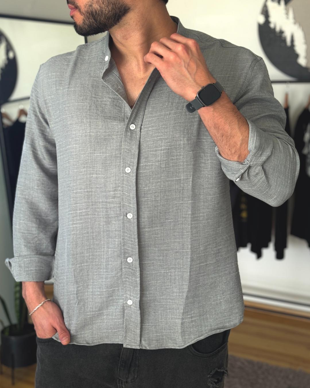 Camisa con cuello mao, jaspeada y disponible en 3 colores: crudo, gris claro y gris oscuro.