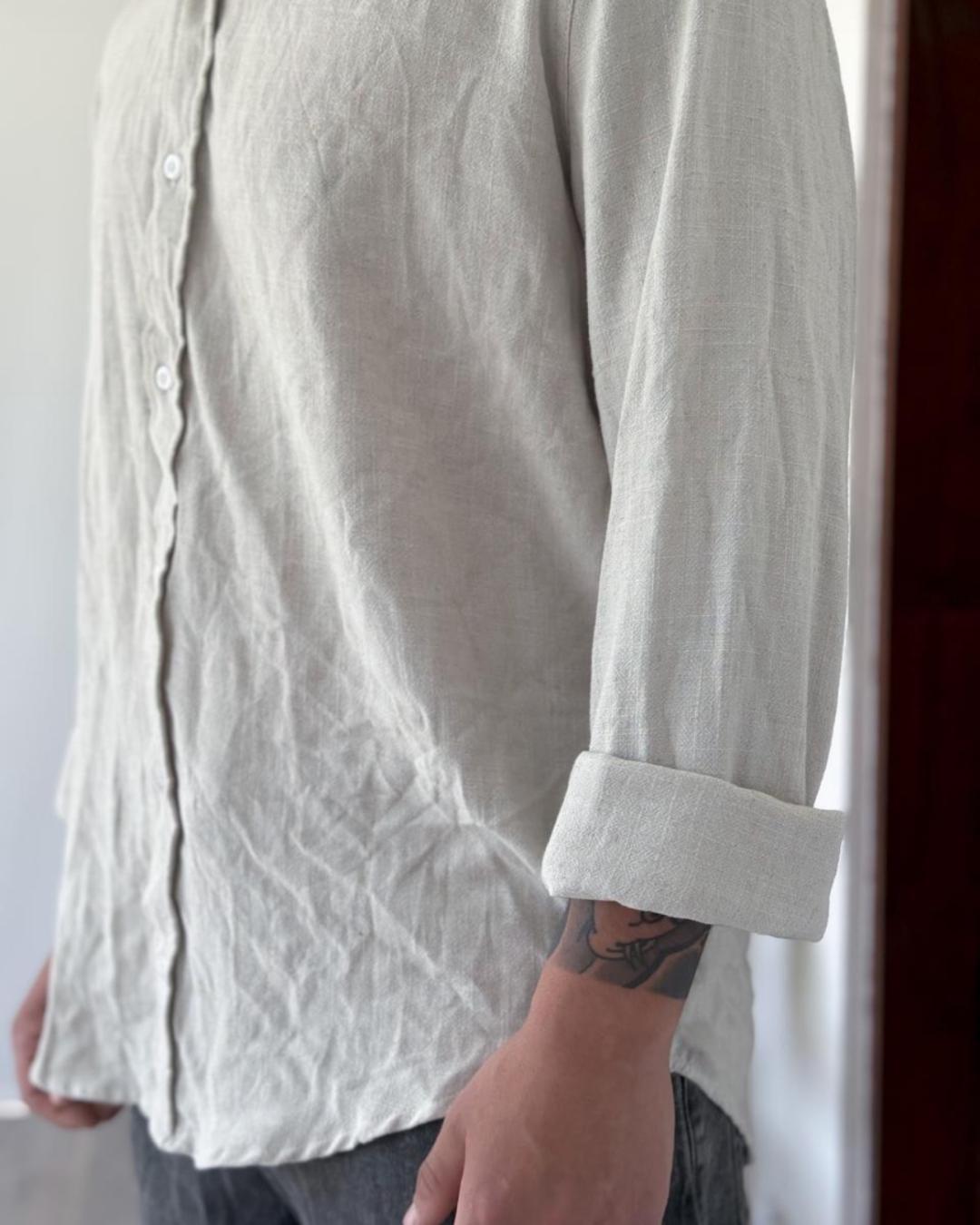 Camisa de lino con cuello mao, disponible en color natural negro y verde.