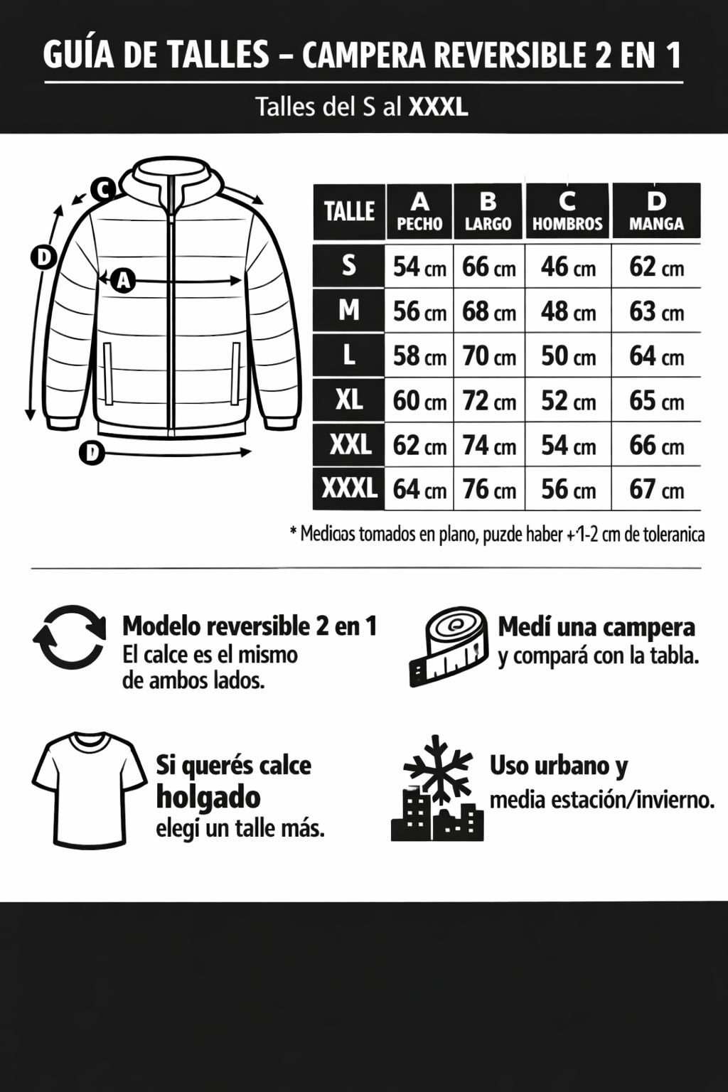 CAMPERA 2 EN 1 REVERSIBLE E IMPERMEABLE DISEÑO EXCLUSIVO. Disponible desde el S al 3XL EN 2 COLORES