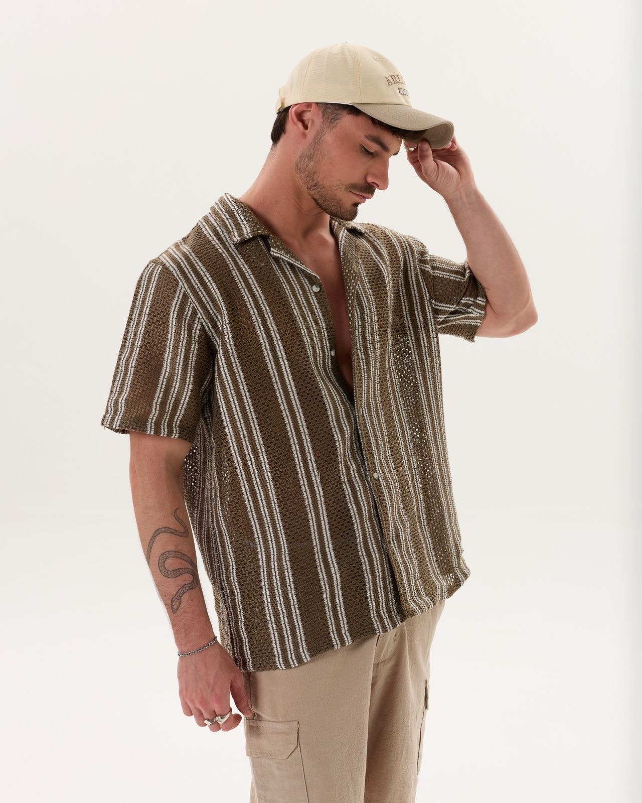 Camisa manga corta tejida, cuello italiano premium y disponible en 4 colores: marrón, negro, beige y blanco.